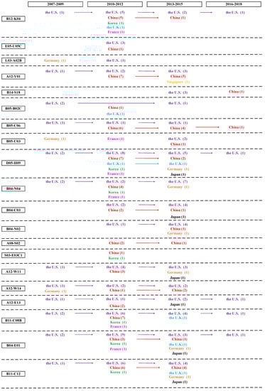 The process of patent roadmap is displayed as the following stages. First, we decide the horizontal axis and vertical axis. Specifically, the horizontal axis represents the time-line. We separate the period from 2007 to 2018 into five three-year periods because the patent application among the high value patents begins at the period from 2007 to 2009; and the vertical axis indicates the specific technological field, representing MC (a unique patent classification code indicating the novel technical aspects of the invention, and its commercial applications) which enabled stakeholders to investigate the evolution trend of a target technical area. Second, nodes indicate countries holding high value patents. Third, we employ arrows to link nodes that belong to the same country. Fourth, nodes are marked. We used different colors to display different countries holding high value patents. The red color represents patentees from China, purple from the U.S., green from Korea, blue from the U.K, orange from Germany, pink from France, black from Japan, and yellow from Singapore.