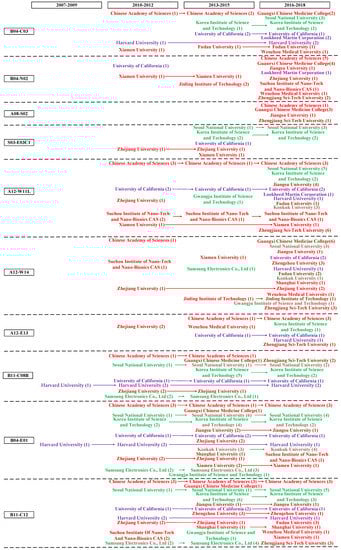 In Figure 3, it illustrates that two assignees from enterprises and eighteen assignees from universities and research institutes. These two patentees from enterprises are Lockheed Martin Corporation from the U.S. and Samsung Electronics Co., Ltd. from Korea. It should be recognized that assignees from China are all belong to universities and research institutes, which suggest a lack of Collaboration among enterprises, universities, and research institutes. As for geographical location, China (12 assignees) overtakes Korea (5 assignees), and the U.S. (3 assignees), and takes the lion’s share, indicating its principle role in graphene biomedical technology. The top three assignees regarding the number of patents are Chinese Academy of Sciences (33), Guangxi Chinese Medicine College (29), and Seoul National University (24). These assignees situated in the lower right quadrant, indicating their competitive advantages in patenting activities. Harvard University, Chinese Academy of Sciences, and Lockheed Martin Corporation have relatively higher technological innovation capability in patent strength, locating in the lower right quadrant. Lockheed Martin Corporation, holding 12 patents, is situated relatively close to the area of the upper right quadrant. This indicates that Lockheed Martin Corporation has a relatively high competitive advantage in technical strength and resources, and plays a crucial role in the future TC. It is clearly shown that there are no assignees situated in the area of the upper right quadrant, which indicate that currently no assignee is the technological and marketable leader with competitive advantage over patent activities as well as resources. Samsung Electronics Co., Ltd. is the only competitor situated in the upper left quadrant, which shows its distinct competitiveness in company resources, so it is challenger in graphene biomedical technology and will become a potential buyer. More than half of the patentees are still situated in the lower left quadrant. Most of the Chinese assignees with relatively lower technological innovation capability are situated in this quadrant. For example, although Jiangsu University, Zhengzhou University, Fudan University, and Shanghai University ranked the top 10 in owning patents, their ability in company resources is relatively low. Lacking technological strength as well as company resources, these Chinese assignees are followers.