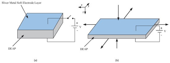 The working principle of dielectric electro-active polymer (DEAP) materials. (a) Power cut: Initial state of DEAP materials. (b) Power supply: Actuation direction of DEAP materials.