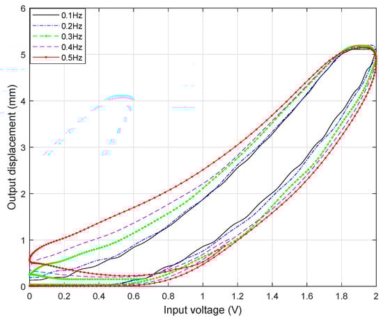 where is the output of the DEAP actuator, is the output of the Hammerstein model, and N is the amount of experimental data. The identified parameters of the PI model, DZ model and ARX model are given in Table 1, Table 2 and Table 3, respectively. Figure 5 shows the asymmetric rate-dependent hysteresis loops of the DEAP actuator in the range of to Hz. It illustrates that the width of the hysteresis loops will gradually increase with increasing frequency of the input signal [,].
