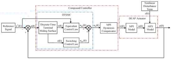In this section, a compound controller is developed for the high-precision trajectory tracking control of the DEAP actuator, as shown in Figure 7. It consists of a feedforward hysteresis compensator and a feedback controller. The inverse MPI model is used to be the hysteresis compensator to offset the hysteresis behavior. A novel DTSMC is proposed to be the feedback controller to improve the trajectory tracking precision and maintain the system stability in the presence of unmodeled hysteresis nonlinearity, inverse compensation errors, residual dynamics, parameter uncertainties and external disturbances.
