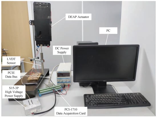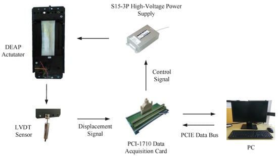 In order to verify the effectiveness of the proposed DTSMC, the controller is deployed on the DEAP actuator for the high-precision trajectory tracking control. The block diagram and the experimental platform of the DEAP actuator are shown in Figure 8 and Figure 9, respectively. The actuator is manufactured by Danfoss PolyPower A/S Inc. Because DEAP materials are flexible materials, the DEAP actuator needs to be suspended vertically in the experimental platform to generate a certain pre-tension force. Considering the real time executions and the simplicity of the controllers development, a personal computer running Windows 10 operating system and Matlab 2017a software is employed. A high resolution split LVDT displacement sensor is utilized to measure the output displacement of the DEAP actuator. Considering the driving voltage of DEAP materials is 0–2500 V, a high voltage source S15-3P is employed. For realizing the data interaction between MATLAB 2017a and the DEAP actuator, a data acquisition card PCI-1710 is used. In this work, the sampling time T is set to s, and a white Gaussian noise is added to the controller as the external disturbance.