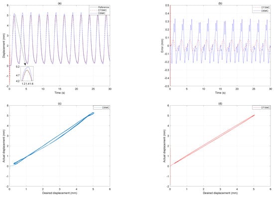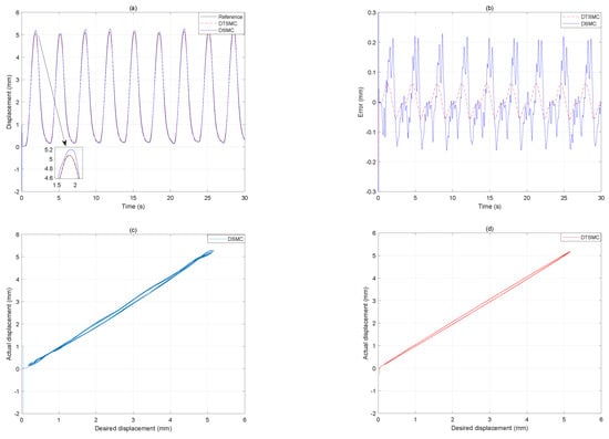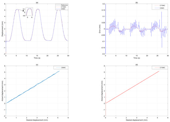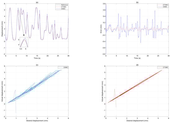 The tracking results under the hybrid frequency input signal. (a) Displacement output. (b) Tracking error. (c) Desired displacement versus actual displacement of the DSMC. (d) Desired displacement versus actual displacement of the DTSMC.