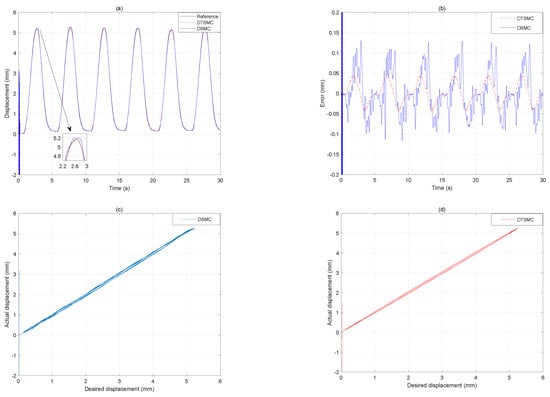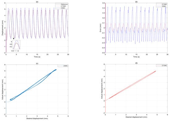 The desired displacement has a frequency of 0.1 Hz, the tracking results of the DSMC and the proposed DTSMC are depicted in Figure 10. The RMSE of the DSMC is mm, and the MAE is mm. In contrast, for the proposed DTSMC, the RMSE is mm, and the MAE is mm. Compared with the DSMC, the proposed DTSMC reduces the RMSE and MAE by and . In addition, from Figure 10c,d, one can see that the hysteresis phenomenon has been substantially compensated by the DTSMC, and the DSMC can also basically compensate the hysteresis phenomenon at a low frequency of Hz.