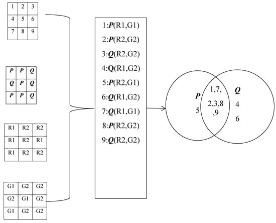 There are two vectors formed by land types P and Q in Figure 1. The population density characteristics are R1 and R2, which means that the formula is R = R1 or R = R2, with different sets of land types P and Q determined by two atomic formulas. The formula R = R1 for land type P is {1}, and for land type Q is {4,6,7}; the atomic formula R = R1 gives the value {{1},{4,6,7}} of land types P and Q, which is the value obtained by the formula R = R1. Similarly, R = R2 for land type P is {2,8}, and for land type Q is {3,5,9}, while the value of land type P and Q obtained by the atomic formula R = R2 is {{2,8}, {3,5,9}}. Obviously, Equation (3) can measure a single value of a single indicator, but it cannot address complex measurement relationships, such as simultaneously measuring atomic formulas R = R1 and R = R2.