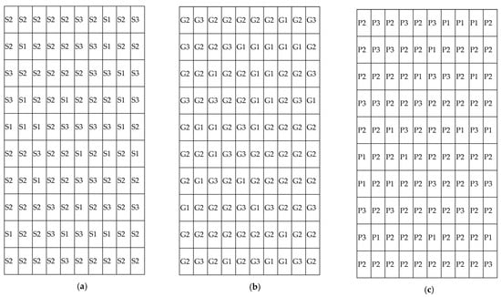 where h is the number of levels, such as high, medium or low levels of GDP, and the distance from a road is one of three levels: far, medium or near. All spatial entities are divided into different granular sets by atomic formulas with different index values according to Equation (4), and such granular sets are indistinguishable at different levels of the same indicator. It is assumed that there are 100 land units divided into three land types: S1, S2 and S3 (see Figure 2). There are two measurements of GDP and population density, and GDP is divided into three levels: G1, G2 and G3; while the population density is divided into three levels: P1, P2 and P3. Thus, {S1,S2,S3} constitutes , where is composed of different sets on G1, G2, G3 from S1. To calculate the similarity, we need to define the membership of different atomic formulas in . is a vector object collection in universe U, The degree to which belongs to a set is defined as [33]: