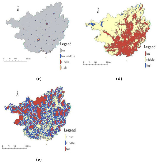 Guangxi is a sea passage in southwestern China, with the advantage being located along the border, along the coast and along the Yangtze River. Guangxi has a complete array of land types, with high and low landforms including mountains, plateaus, middle mountains, hills, terraces and plains. Having entered a new era of industrialization and rapid economic development in Guangxi, land use has changed dramatically. This paper will use the 2010 data on land use in Guangxi (Figure 3b), the Guangxi GDP kilometre network data in 2010 (Figure 4a), the data of the Guangxi population density kilometre network in 2010 (Figure 4b), the data of Guangxi DMSP/OLS in 2010 (Figure 4c), Guangxi Digital Elevation Model (DEM) data (Figure 4d) and Guangxi road data (Figure 4e), using the method proposed in this paper to verify the spatial similarity of different land types in Guangxi. The road data source of this study is the open street map (https://www.openstreetmap.org), and other data are from the data collection of the Resource and Environmental Science Data Center of the Chinese Academy of Sciences (http://www.resdc.cn/Default.aspx). There were seven types of first-level land use and 22 types of second-level land use in Guangxi in 2010, where cultivated land, forest land and grassland areas dominated, and the proportion of unused land and sea areas was small, as is seen in Table 2.