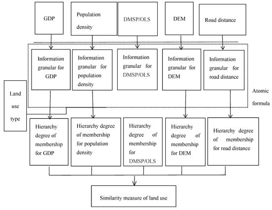 Using the granular similarity measure method proposed in this paper combined with the 22 land use change data in Guangxi and the spatial distribution data of five socio-economic attribute indexes, we designed the similarity measure of the land use change type attribute computing framework in Guangxi (Figure 5). The five socio-economic indexes are continuous data, and they were separately resampled and discretized to obtain spatially discrete data of the five indexes to form hierarchical data of the index sets. Then, different values of different indexes were used as atomic formulas to form the granular information set of each index, and the number of statistical indexes at different levels in the granular information concentration was calculated by determining the index membership degree for different land use types. Finally, the land use type membership function for each index provided the socio-economic similarity measure between 22 land use types in Guangxi.