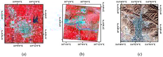 In this study, three case images without cloud or snow downloaded in Geospatial Data Cloud [23] were used of which two were obtained in summer when vegetation is lush and one was obtained in winter when vegetation is withered and bare soil is widely distributed. The image sizes are 480 rows × 480 columns with a pixel size of 30 m, and their (5, 4, 3) false colour composites are shown in Figure 1.