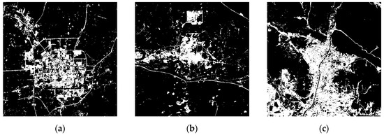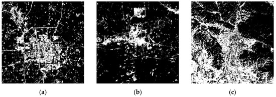 The impervious surface distribution extracted by the proposed method after atmospheric correction: (a) Case 1; (b) Case 2; (c) Case 3.