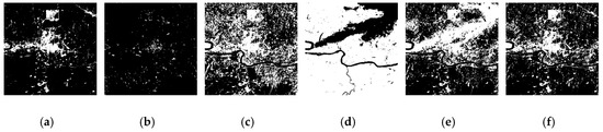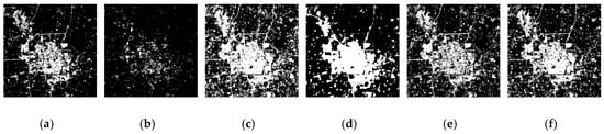 The impervious surface distribution in Case 3 extracted by six methods after water bodies were masked: (a) RISI; (b) NDBI; (c) IBI; (d) NDISI; (e) NDII; (f) CBI.