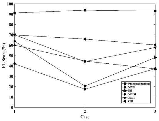 The recalls and precisions of the six extractions are shown in Figure 7, and the F1 scores are shown in Figure 8. The NDBI, IBI, NDISI, NDII, and CBI gave high recalls and low precisions, especially in Case 3 which had a large amount of bare soil, where the F1 scores were all less than 65%. The extraction accuracy by the proposed method was higher than others in our three case images, and the average values of the recall, precision, and F1 score were 95%, 91%, and 93%, respectively.