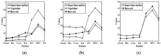 Spectral features of impervious surfaces, bare soil and vegetation in images after water bodies were masked: (a) Case 1; (b) Case 2; (c) Case 3.