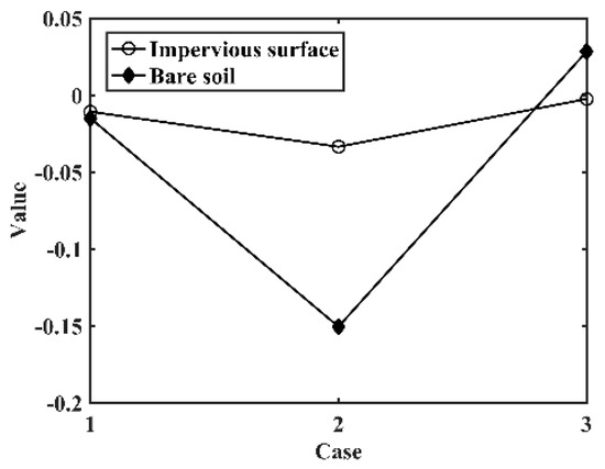 Typical samples of impervious surfaces, bare soil, and vegetation were selected from each case image after water bodies were masked, and the mean spectral values for each type of sample were calculated to obtain their spectral curves (Figure 2). These show that impervious surfaces had similar spectral features to those of bare soil. The DN value of impervious surfaces in the coastal band was higher than those of vegetation and bare soil, and vegetation had the largest difference between the DN values in the red and near-infrared bands, followed by bare soil. In the TIR1 band, the DN value of impervious surfaces was the highest in Case 2, whereas in Cases 1 and 3 the DN value of bare soil was the highest.