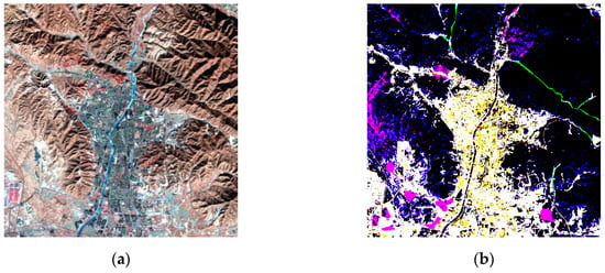 Taking Case 3 as an example, Figure 12 shows the difference between the impervious surface distribution extracted before and after atmospheric correction, where (a) is a false colour composite of the (5, 4, 3) band and (b) is an RGB composite of the impervious surface distribution extracted before atmospheric correction, ground truth for the impervious surface distribution and the impervious surface distribution extracted after atmospheric correction. Here, the white areas were extracted in both instances, the green areas were lost in both instances, the purple areas were mis-extracted in both instances, the yellow areas were lost after atmospheric correction, and the blue areas were only mis-extracted after atmospheric correction.