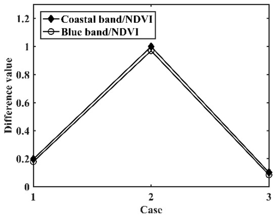 Differences in the coastal band/NDVI and blue band/NDVI between impervious surfaces and other ground objects.