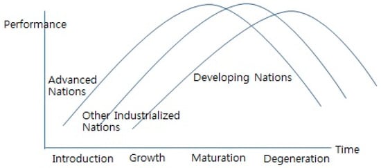 While connectivity is the core element of the 4th industrial revolution [9], technology life cycle and product life cycle theories still hold their validity even for Industry 4.0 [10]. Proposed by Vernon in 1966, the product life cycle theory shows that there are product flows among country groups based on how early a country can initiate a new movement. Advanced industrial nations start the waves, which then flow into less developed countries. The technology life cycle theory follows the same logic, but focuses on technology flow [11] (Figure 1).