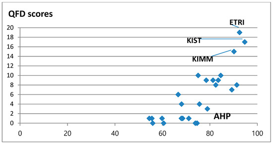 After completing both the AHP and QFD analyses, we plotted their results to link research institutions and their potential contribution to the 4th industrial revolution. The focus was on finding those institutions that scored high on both analyses. These organizations can serve as the mediating entity for collaborative research in the 4th industrial revolution.