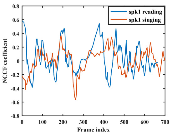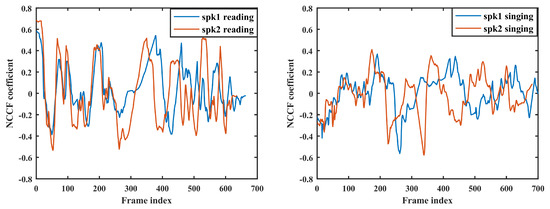 Pitch is one of the most important features for describing the excitation source property in speech signal processing [24]. We used the Normalized Cross Correlation Function (NCCF) coefficients [22] extracted by using the Kaldi pitch tracker [25] to represent the pitch information for our ASV. The NCCF is not the normal pitch value; it is a pitch estimation method that is very similar to the autocorrelation function, but it better follows the rapid changes in pitch and the amplitude of speech signal. In comparison with the normal autocorrelation function, the peaks corresponding to pitch period in the NCCF are more prominent and less affected by the rapid variations in the signal amplitude. In [22], the effectiveness of NCCFs has been proved on speech recognition tasks. Figure 1 shows the NCCF contour of the same female speaker’s reading and singing speech with the same text. Figure 2 shows the NCCF contour of reading and singing speech between two different female speakers, given with the same text.