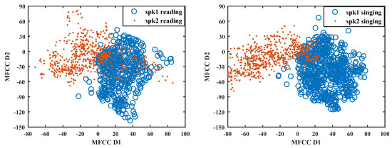 MFCC is a conventional frequency-domain auditory perception cepstral coefficient method. MFCCs have been widely used in both the speech and speaker recognition applications [1]. We first extracted the 20-dimensional (c0–c19) MFCC features using the Kaldi Toolkit [25]. Then, to visualize the MFCC discrimination between different speakers more clear, we applied the Principal Component Analysis (PCA) algorithm to reduce the 20-dimensional MFCCs to a two-dimensional feature space. Finally, we performed the feature analysis in this low-dimensional space. Similar to the above NCCF information contour, Figure 3 demonstrates the two-dimensional PCA feature distribution of MFCCs of both the reading and singing speech between two different female speakers, given the same text.