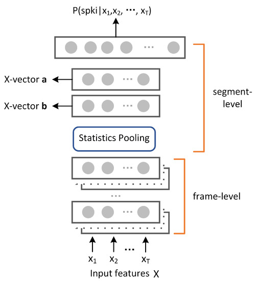 Figure 4 shows the detail architecture of the X-vector extractor model. The first five layers of the network worked at the frame level, with a time-delay architecture [34]. Suppose t is the current time step. At the input, we spliced together frames at . The next two layers splice dtogether the output of the previous layer at times and , respectively. The next two layers also operate dat the frame-level, but without any added temporal context. In total, the frame-level portion of the network had a temporal context of to frames. Layers varied in size, from 512 to 1536, depending on the splicing context used. The statistics pooling layer received the output of the final frame-level layer as input, aggregated over the input segment, and computed its mean and standard deviation. These segment-level statistics were concatenated together and passed to two additional hidden layers with dimension 512 and 300 (either of which could be used to compute embeddings; in this study, the X-vector b was taken as our X-vectors) and finally the softmax output layer. The X-vector extractor network was trained to classify training speakers using a multi-class cross entropy objective function. Please refer to the work of Snyder [3] to obtain more details of the extractor training.