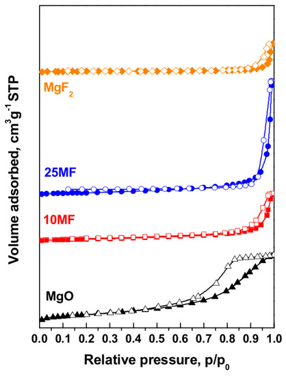 The isotherms of low-temperature N2 adsorption on MgF2, MgF2/MgO, and MgO calcined at 500 °C in air are shown in Figure 1. All the isotherms can be classified as IV(a), according to the International Union of Pure and Applied Chemistry (IUPAC) classification [12], i.e., the type that is characteristic of mesoporous materials. The isotherm measured for MgO calcined at 500 °C exhibits a hysteresis loop of type H2(b), which indicates capillary condensation occurred in the mesopores.