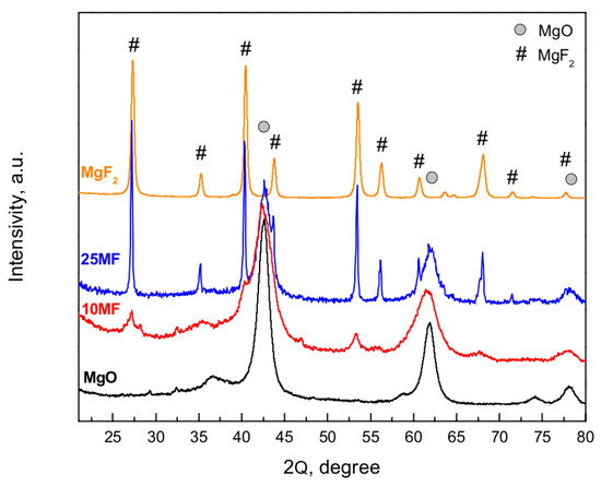 X-ray diffraction patterns (Figure 2) show that in the MgF2/MgO system calcined at 500 °C, no mixed phase was formed. The studied samples contained only separate phases of MgF2 and MgO.