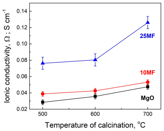 A particularly important parameter for cell operation is the ionic conductivity of molten electrolyte-containing pellets (Figure 3). In this respect, magnesia impregnated with MgF2 is clearly the best choice. An exceptionally high ionic conductivity was observed for the 25 MF system—it was threefold higher than in the case of bare MgO. The reason for this fact can be the presence of MgF2, directly contacting the electrolyte. Additionally, the ionic conductivity increased with a rising filler calcination temperature. However, Table 2 shows that at the same time, the electrolyte absorption declined, which is adverse for the operation of the entire electrolyte–filler system. The exceptionally high ionic conductivity makes it possible to use a greater amount of the filler and to reduce the amount of expensive electrolyte without any deterioration in the operation of the high-temperature cell. This should improve the absorption of the electrolyte and reduce the possibility of its leakage during the operation of the system.