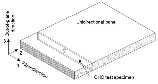 OHC specimens used in this work are machined from thick unidirectional panels, as illustrated in