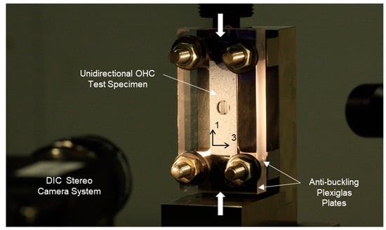 Figure 2 showing a unidirectional OHC test specimen installed in the test fixture including the anti-buckling Plexiglas plates. One of the two cameras used for DIC monitoring of surface deformation is also visible in the foreground in