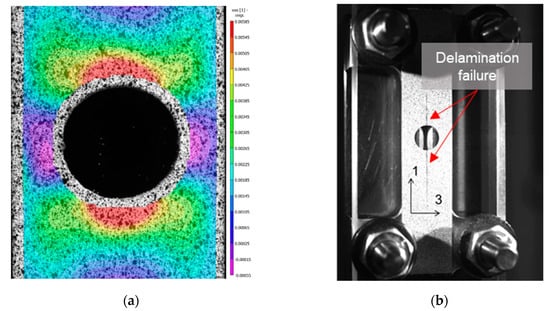 Figure 4a shows an example of interlaminar normal strain distribution on the surface of a unidirectional IM7/8552 OHC specimen measured prior to failure using the DIC technique and showing ILT strain concentrations around the hole.