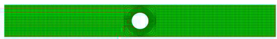 Figure 6. The FE model is generated for Abaqus FEM analysis and includes about 5000 four-node bilinear 2D plane stress elements CPS4 from Abaqus element library. The total number of nodes is about 5300 and the total number of degrees of freedom is approximately 11,000. A linear elastic homogenized orthotropic material model is used for implicit static stress/displacement analysis using Abaqus standard solver. Mesh refinements are assigned to ensure proper convergence of the stress field around the hole. A mesh sensitivity study showing convergence of the ILT stress field around the hole with mesh refinement is provided in