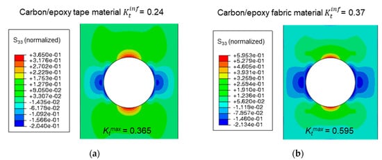 OHC coupons ILT stress concentration factors differ from for an infinite plate since they account for the effect of finite width, for which there is no obvious closed-form solution for anisotropic materials as previously mentioned. In these examples, a maximum ILT stress concentration factor of 0.365 is obtained for the tape material, versus 0.595 for the fabric material. These values can be compared to = 0.24 and = 0.37 for an infinite plate with a circular hole for the tape material and fabric material, respectively.