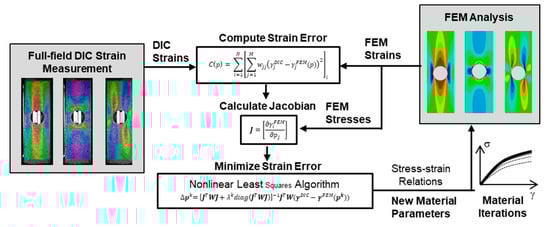 32] where the cost function is defined as the weighted root mean square (RMS) error between FEM-computed and DIC-measured surface strains. The reader is referred to Reference [