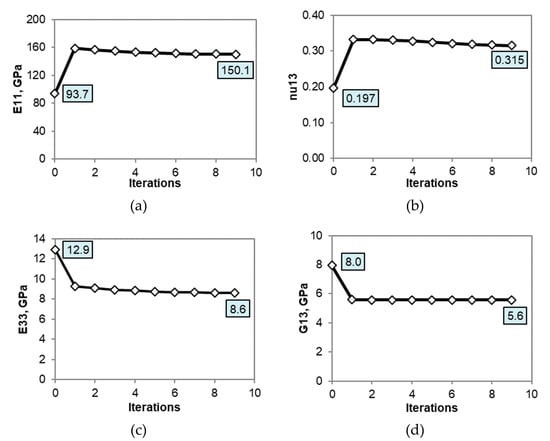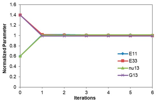 Figure 11 shows an example of convergence of the material parameters for the FEMU procedure using experimental DIC strain data from OHC testing of a generic carbon-epoxy unidirectional specimen. The threshold for convergence is reached after nine iterations, however effective convergence is pretty much achieved after two or three iterations, as illustrated. In this example, convergence is illustrated for a 50% maximum relative error in the initial approximation of the interlaminar Young’s Modulus