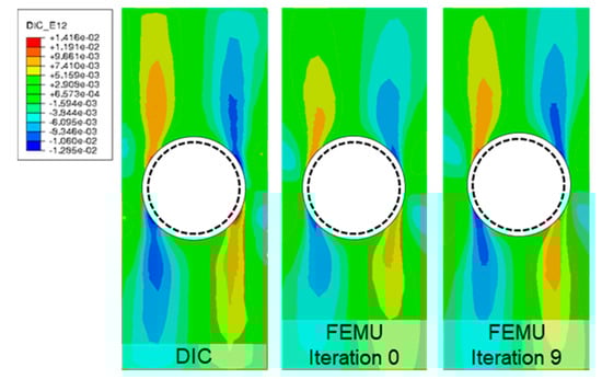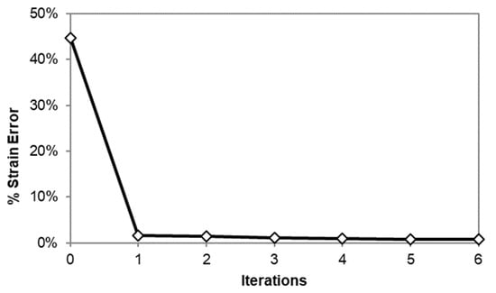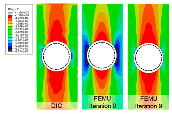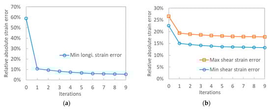 Figure 14a shows the evolution of relative absolute strain error between FEM and DIC during the FEMU iterative procedure for the minimum longitudinal strain value in the contour plots shown in