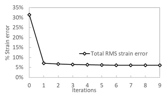 Figure 14b shows that the converged point-local relative error for both the maximum and minimum shear value is still relatively high at the end of the FEMU process (respectively 17.8% and 13.3%). However, this point-local error should be compared to the total weighted strain error, which takes into account the full-field strain data for all DIC images taken throughout the loading. The weights for calculation of the RMS strain error are defined in Equation (2). The evolution of the total weighted RMS during FEMU iterations is shown in