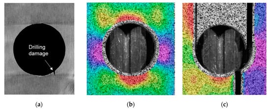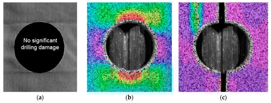 Figure 19c shows that delamination failure in this specimen initiated at the location of the initial flaw, instead of initiating at the 12 and 6 o’clock location for pristine specimens. In some specimens, surface strain distribution was visibly affected by the drilling damage, as suggested by the asymmetry of ILT strain field shown in