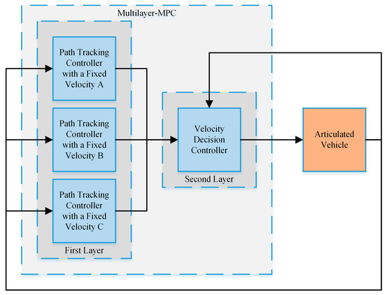 At present, many path tracking controllers are unable to actively adjust the longitudinal velocity according to path information, such as the radius of the curve, to further improve tracking accuracy. For this problem, we propose a new path tracking framework based on model predictive control (MPC). This is a multilayer control system that includes three path tracking controllers with fixed velocities and a velocity decision controller. This new control method is named multilayer MPC. This new control method is compared to other control methods through simulation. In this paper, the maximum values of the displacement error and the heading error of multilayer MPC are 92.92% and 77.02%, respectively, smaller than those of nonlinear MPC. The real-time performance of multilayer MPC is very good, and parallel computation can further improve the real-time performance of this control method. In simulation results, the calculation time of multilayer MPC in each control period does not exceed 0.0130 s, which is much smaller than the control period. In addition, when the error of positioning systems is at the centimeter level, the performance of multilayer MPC is still good.