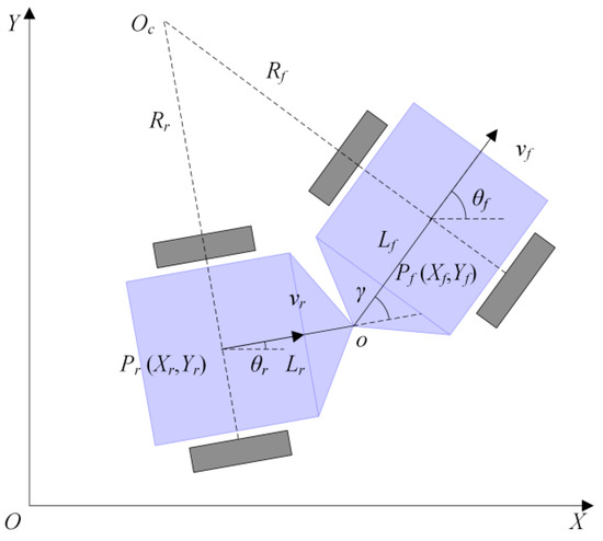 The basis of the predictive model is the kinematic model of articulated vehicles. We still use the model in [5]. This model is very mature and its application is very extensive. In this kinematics model, we ignore the force of the tires and consider the bodies of the articulated vehicle as rigid bodies. The kinematics model is presented in Figure 2. The definition of the parameters is presented in [5].