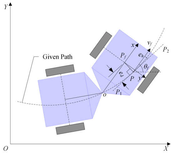 An autonomous vehicle system usually consists of mapping, positioning, perception, and navigation. Path tracking is a core system of the autonomous navigation system. Its task is to control the vehicles devices to track the reference path by minimizing errors [1,2,3,4]. Based on our previous work [5], this paper still focuses on the path tracking of articulated vehicles. Of course, the control method proposed in this paper can also be applied in the path tracking of mobile devices such as front-wheel steering vehicles and differential robots.