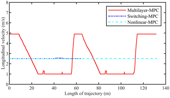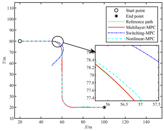 Firstly, multilayer MPC, switching MPC, and nonlinear MPC are compared. The reference velocity of the multilayer MPC controller was set to 5 m/s, and that of the other two controllers was set to 2.5 m/s. Figure 4 shows the tracking results. Multilayer MPC and switching MPC successfully completed the control task, however, switching MPC failed. According to [5,16,17,18], switching MPC can complete path tracking when the reference velocity is low or the radius of the reference path is large.