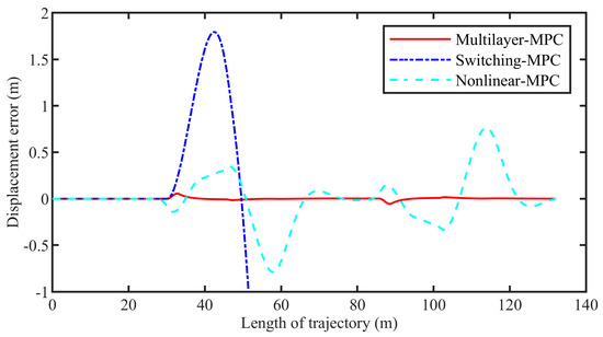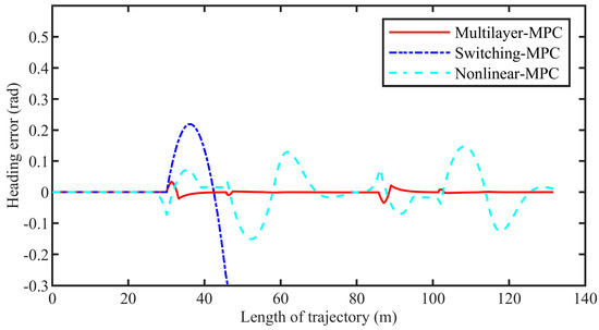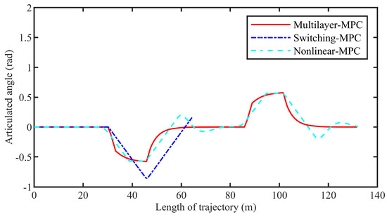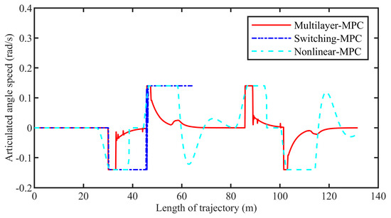 Figure 5, Figure 6 and Figure 7 show the longitudinal velocity, articulated angle, and articulated angle speed, respectively. All control inputs and states are within the system constraints. The displacement error is shown in Figure 8. The heading error is shown in Figure 9. The errors of switching MPC are divergent. The maximum errors of the other controllers are shown in Table 2. The maximum displacement and heading errors of multilayer MPC are 92.92% and 77.02% smaller than those of nonlinear MPC, respectively.