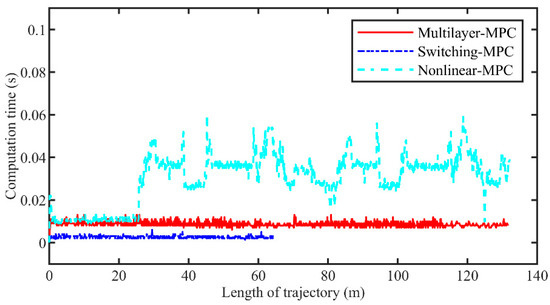 Multilayer MPC shows strong real-time performance, as shown in Figure 10. Its maximum calculation time in each control period was 0.0130 s, and its average calculation time was 0.0086 s. The real-time performance of multilayer MPC is significantly better than that of nonlinear MPC. Of course, the best control method for real-time performance is switching MPC, but this control method cannot control the articulated vehicle tracking reference path under this simulation condition.