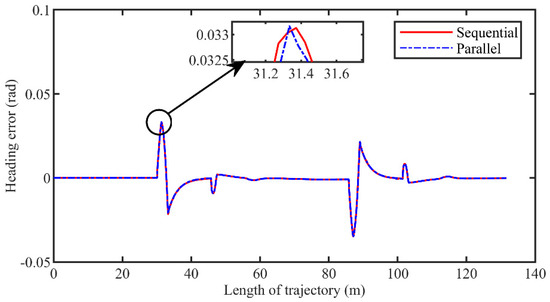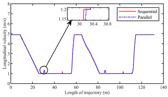 From a theoretical point of view, sequential computation and parallel computation only have an effect on real-time performance but have no effect on control accuracy. In a trajectory figure similar to Figure 4, it is difficult to observe the difference between the two topologies. So, in this group of simulations, we will compare the control inputs and states.