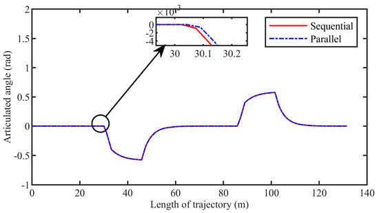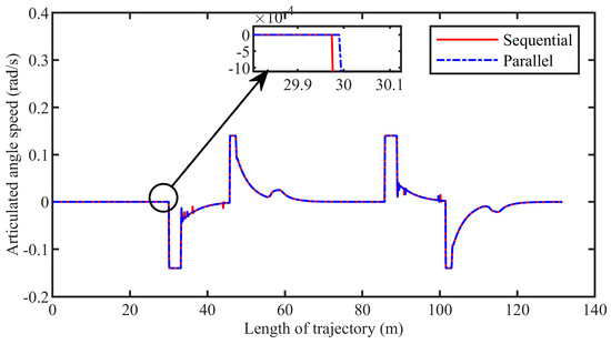 Figure 12, Figure 13, Figure 14, Figure 15 and Figure 16 show the longitudinal velocity, articulated angle, articulated angle speed, displacement error, and heading error, respectively. In theory, the variables of the two topologies should be identical. In the simulation, there were some deviations on a small scale. This phenomenon is caused by factors such as the sampling interval in the simulation.
