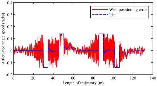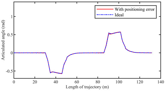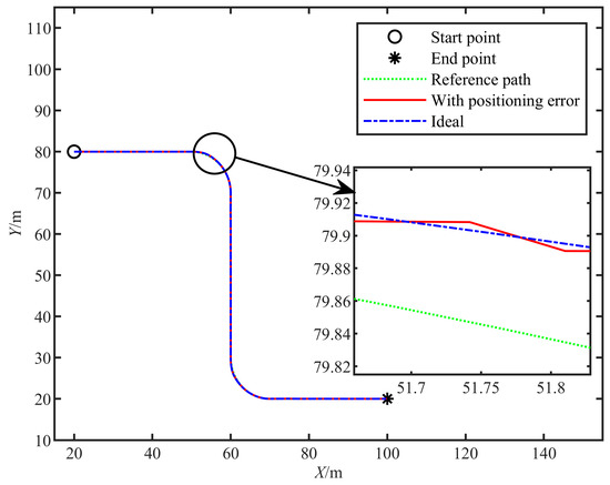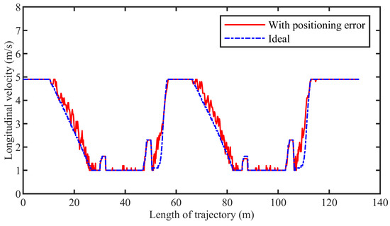 At present, positioning devices such as BDM670 of Beijing BDStar Navigation Co. Ltd can provide centimeter-level positioning. Consequently, we added a random error within ± 0.01 m to the horizontal and vertical coordinates of the articulated vehicle model. Since the judgment of Equation (30) is based on errors, positioning errors will affect the function. To avoid the articulated vehicle always traveling at the minimum of the reference velocity, we increased and . In this group, was 4 and was 2.
