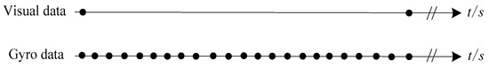 For a heterogeneous sensors integrated system, there is always a sampling frequency discrepancy problem, namely the multi-frequency problem. The sampling frequencies of different sensors are probably inconsistent. The vision and inertial integrated attitude measurement system, is constructed of two heterogeneous sensors, namely the MEMS-based gyroscope and camera. The sampling frequency of the camera is often several or dozens of Hertz while that of the gyroscope is hundreds of Hertz. There is considerable sampling frequency discrepancy between them, as shown in Figure 1.