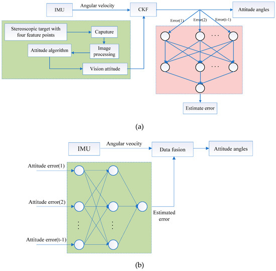 To avoid the attitude divergence phenomenon created by the attitude differential equation when only depending on inertial data during the intersampling of slow visual data, the traditional single frequency data fusion method needs to be improved. Nowadays, the deep learning algorithms are widely used in signal trend prediction to enhance the performance of data fusion in different applications. An artificial neural network [23] is used to enhance the attitude accuracy, which has the characteristic of strong machine learning. Long-short term memory [24] is employed to fuse the inertial and vision data, which can provide high precision for attitude measurement. These methods focus on reducing the attitude error by training the neural networks algorithm when the visual data are available. However, when the visual data are unavailable, these methods cannot ensure the high accuracy of attitude measurement due to the differences in sampling frequency. A convolutional neural network–support vector machine [25] method is used to remove the faults in data fusion, which have impactful effect. A convolutional neural network [26] is proposed to improve the accuracy of data fusion, which is robust and reliable. These methods can effectively fuse data, but they have some limitations in multi-frequency integrated attitude measurements.