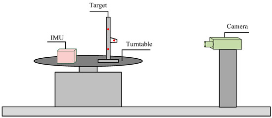 A semi-physical simulation platform for attitude measurements is established, as shown in Figure 5, to evaluate the performance of the inertial and vision data fusion algorithm based on RBF and CKF. The camera is fixed onto the bracket, which is installed on the platform. Furthermore, the target and IMU are fixed on the turntable. The target is represented by four non-coplanar infrared LEDs [31,32,33,34,35,36], as shown in Figure 5. An external PC collects the image data and the angular velocity from the camera and a built-in gyroscope of IMU separately. With only four feature points, the workload of image processing and feature matching is greatly reduced, and the computational efficiency of data fusion is largely improved. In this experiment, the specifications of the gyroscope in IMU are given in Table 1.